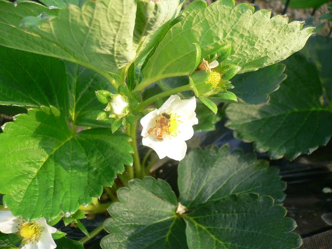 みつばちがイチゴの花にとまり、受粉させてます。